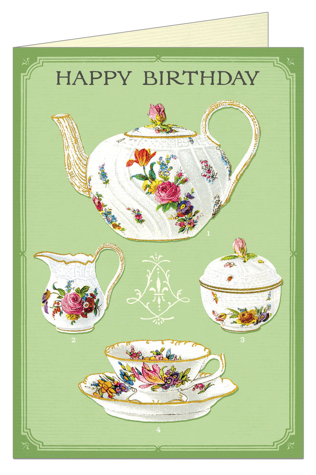 Cavallini & Co. Tea Time Single Blank Birthday Card says simply "Happy Birthday" across the top, with a lovely vintage tea service adorning the card. The card is blank inside and ready for your personal message!