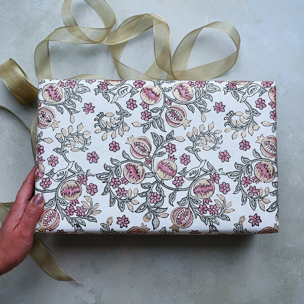 Handmade Indian Cotton Paper- Block Printed Pomegranate- Pink Earth